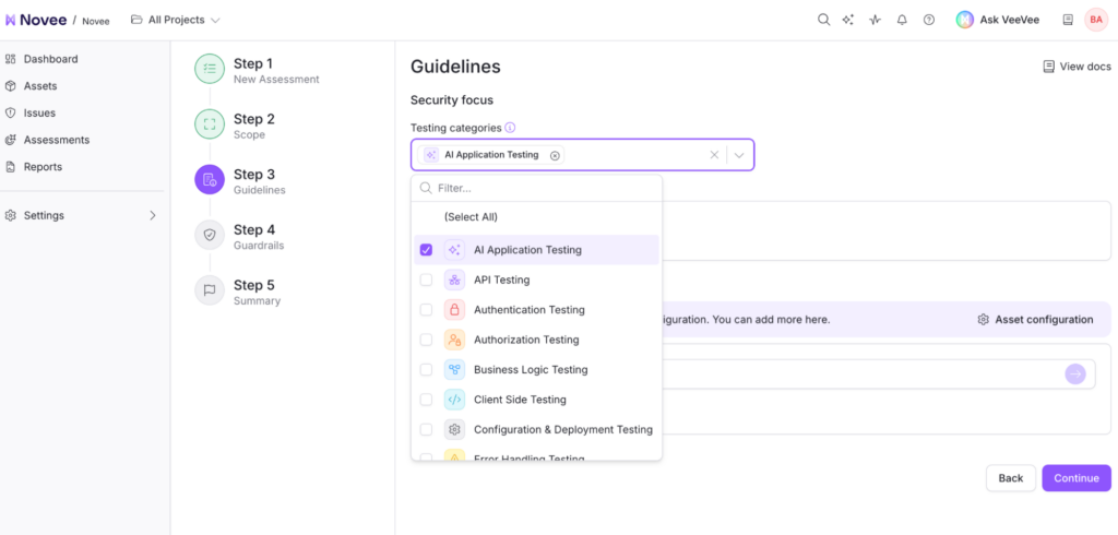 The option to set AI Application Testing as a Security focus is now available in Guidelines on the Novee platform.
