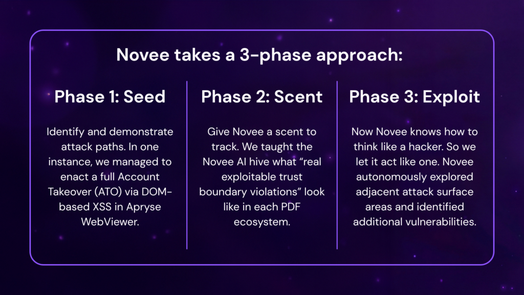 In Phase 1, our researchers manually identified 3 foundational vulnerability patterns. In Phase 2, the “hive” of Novee agents then learned how to find these same structural patterns. Once the agents internalized the “scent,” in Phase 3 they autonomously explored the massive attack surface of both Apryse and Foxit.